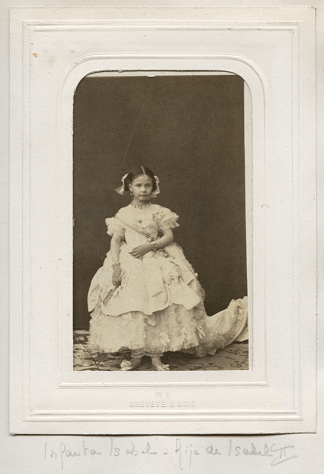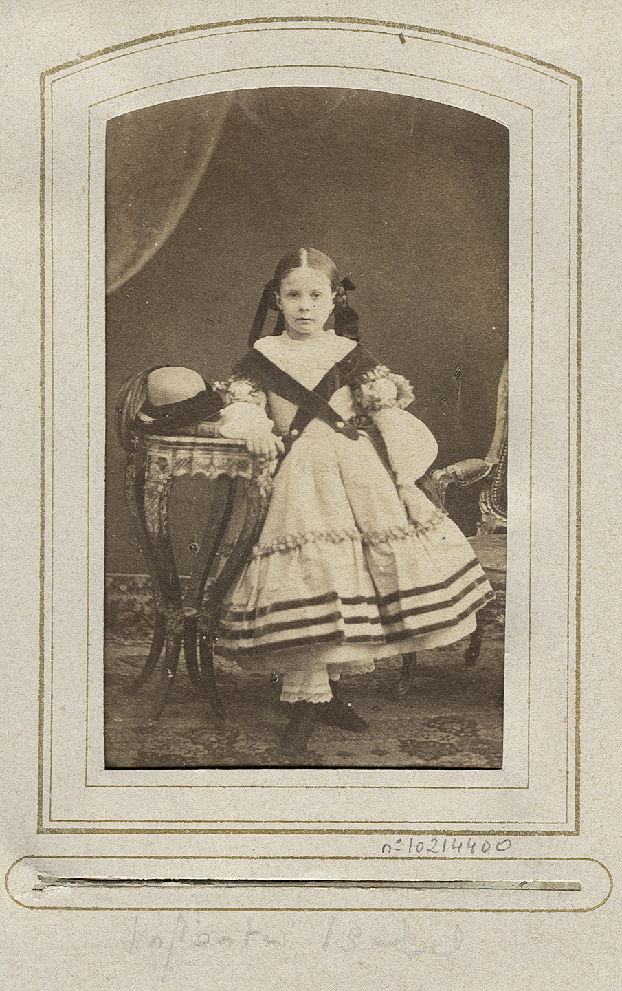 Hija primogénita de Fernando VII (1784-1833) y de su cuarta esposa, María Cristina de Borbón Dos Sicilias (1806-1878), la futura Isabel II fue jurada Princesa de Asturias ante las Cortes españolas, reunidas en la Iglesia de San Jerónimo el Real de Madrid, el 20 de junio de 1833. Apenas tres meses después, se convirtió en Reina de España tras el fallecimiento de Fernando VII el 29 de septiembre de ese mismo año. Durante su minoría de edad, actuaron como regentes, primero su madre, la reina María Cristina, y después el general Baldomero Espartero.La infancia de Isabel II se vio condicionada no sólo por el estallido de la primera Guerra Carlista (1833-1840), que puso en cuestión su legitimidad como Soberana...